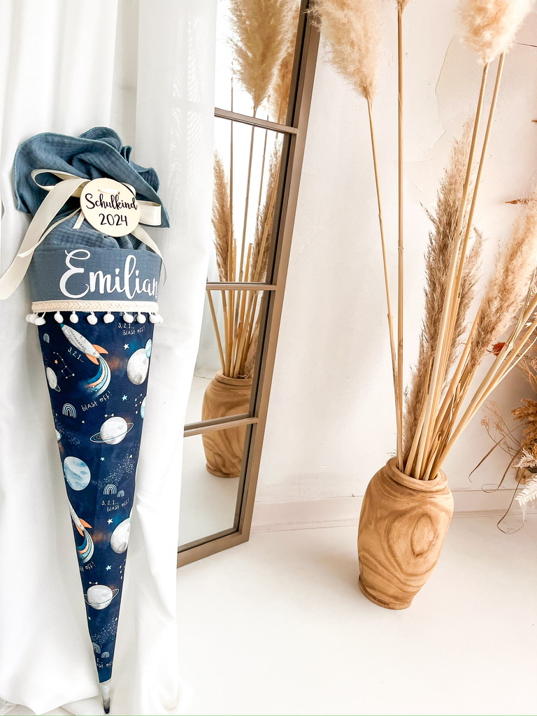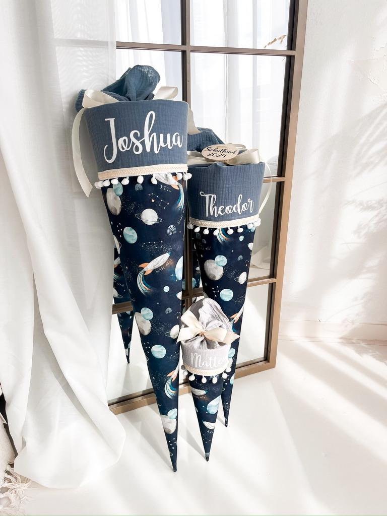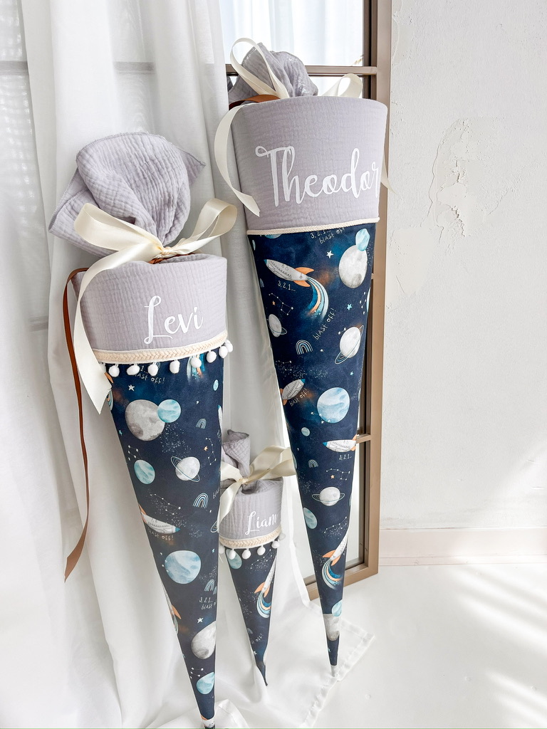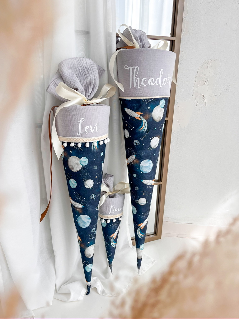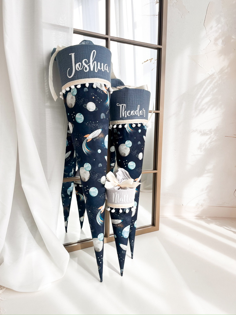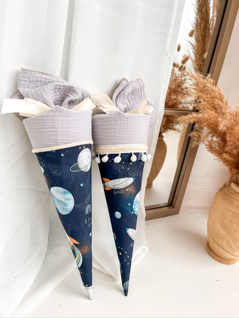 Der Schultütenrohling aus Karton zur Stabilisierung ist bereits im Lieferumfang enthalten und misst stolze 70cm oder 85 cm. Mit dem sorgfältig ausgewählten Stoff ummantelt, erreicht die Schultüte eine Gesamtgröße von ca. 100cm bzw. 115 cm.