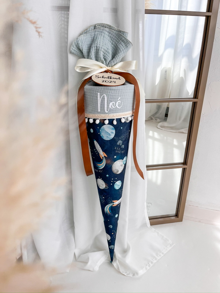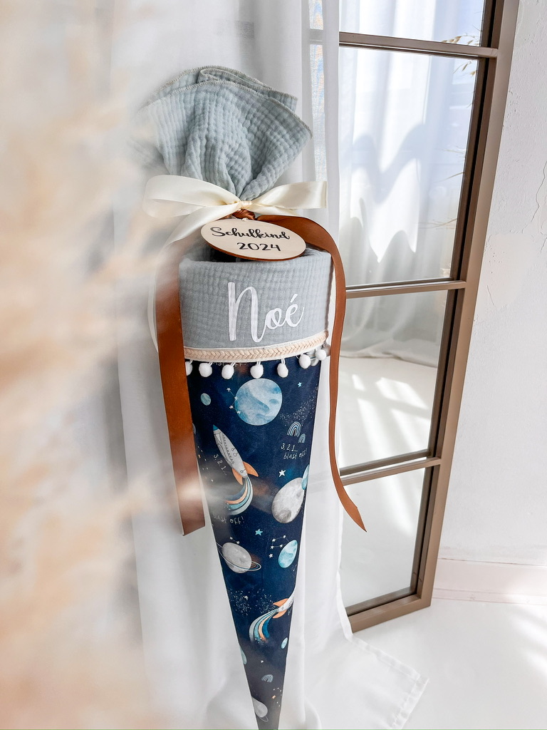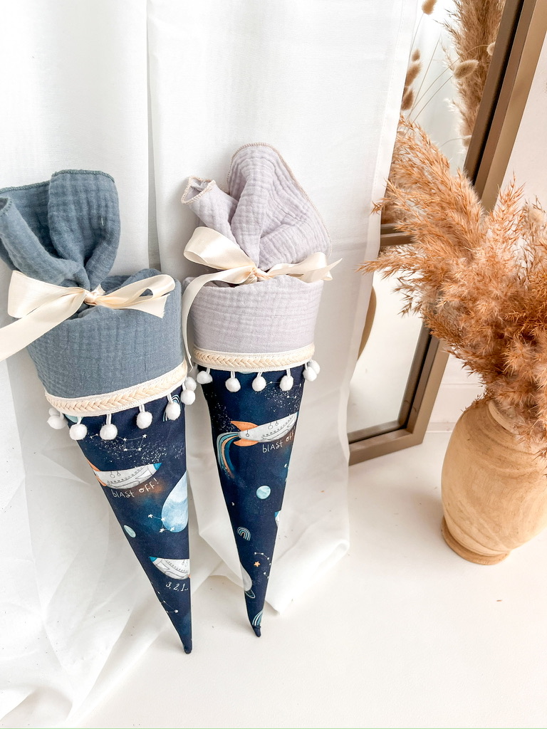 Entdecke außerdem die Auswahl zwischen einer dekorativen Borte inklusive Bommeln oder einer schlichten Variante mit Kordel, um sicherzustellen, dass deine Schultüte ganz individuell gestaltet ist und perfekt zu dir passt.