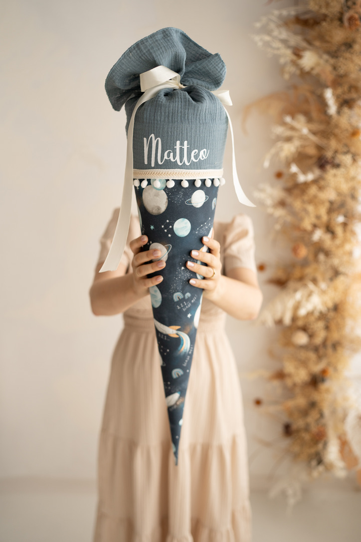 Entzückend und in aufwendiger Handarbeit gefertigt präsentiert sich diese Schultüte aus feinem Musselin und Baumwollstoff, liebevoll verziert mit dem Namen deines Kindes.