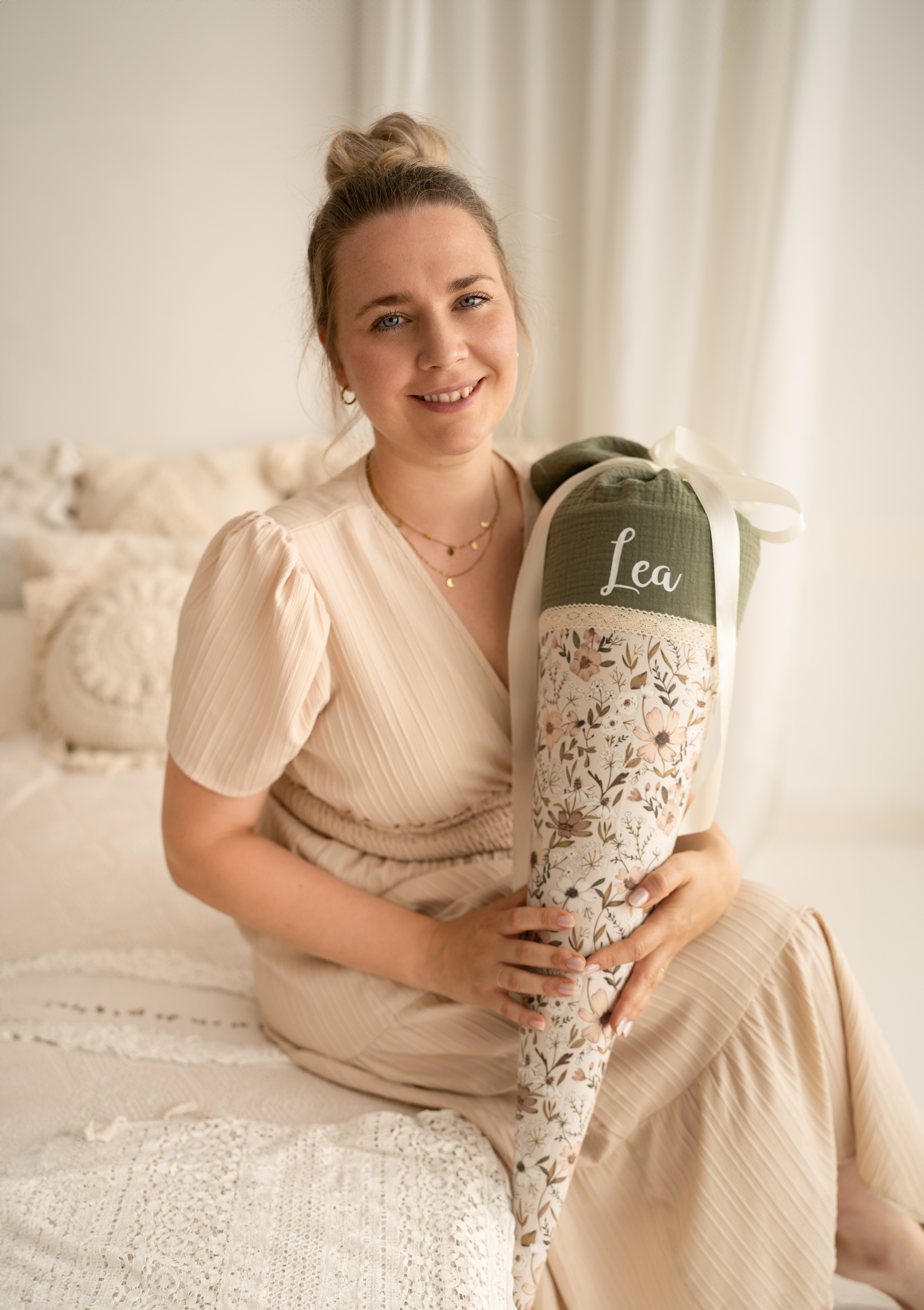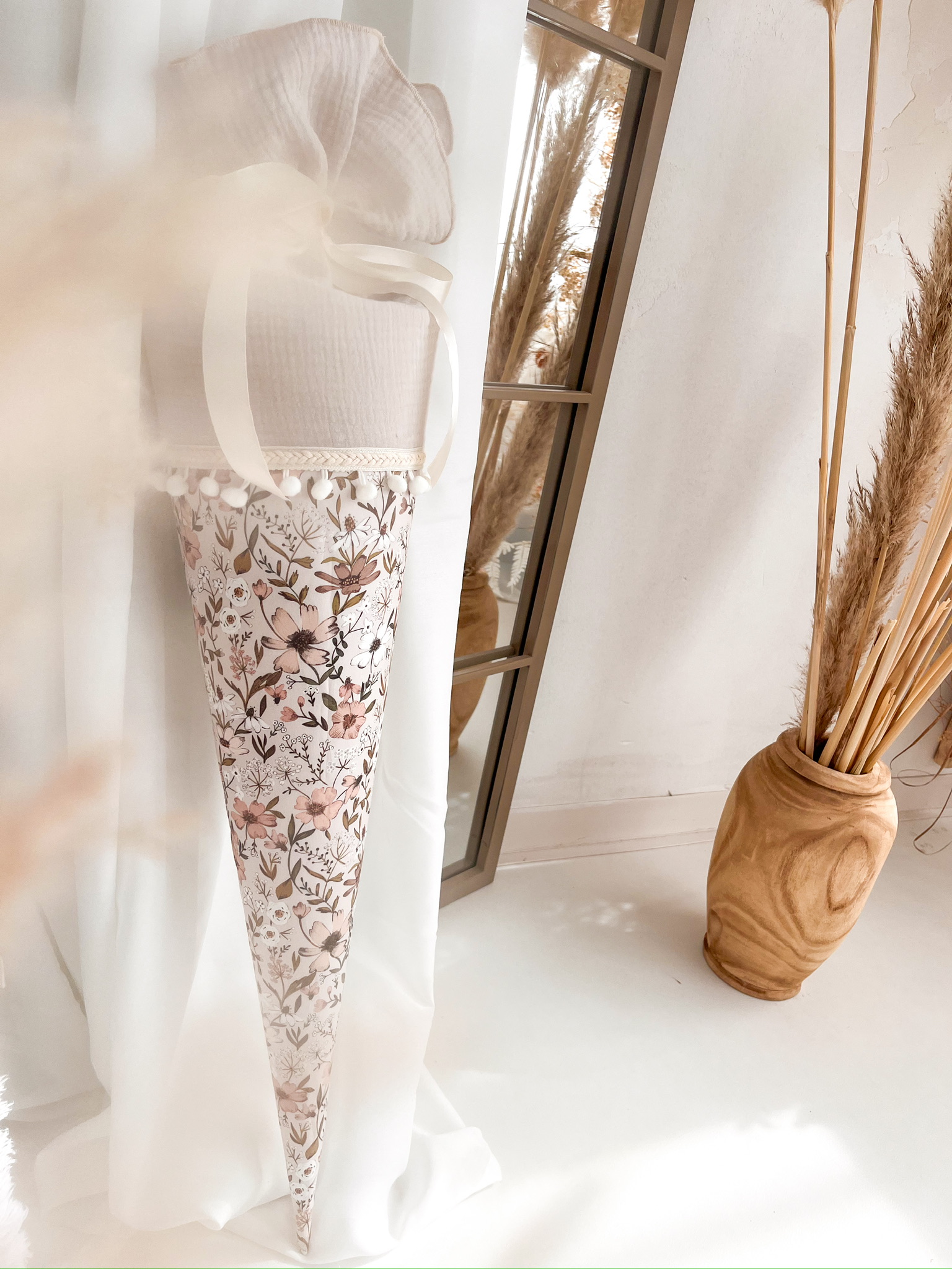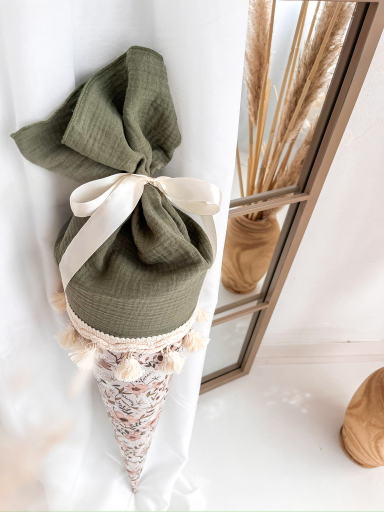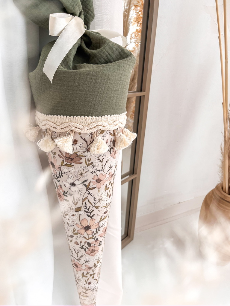 Entzückend und in aufwendiger Handarbeit gefertigt präsentiert sich diese Schultüte aus feinem Musselin und Baumwollstoff, liebevoll verziert mit dem Namen deines Kindes.