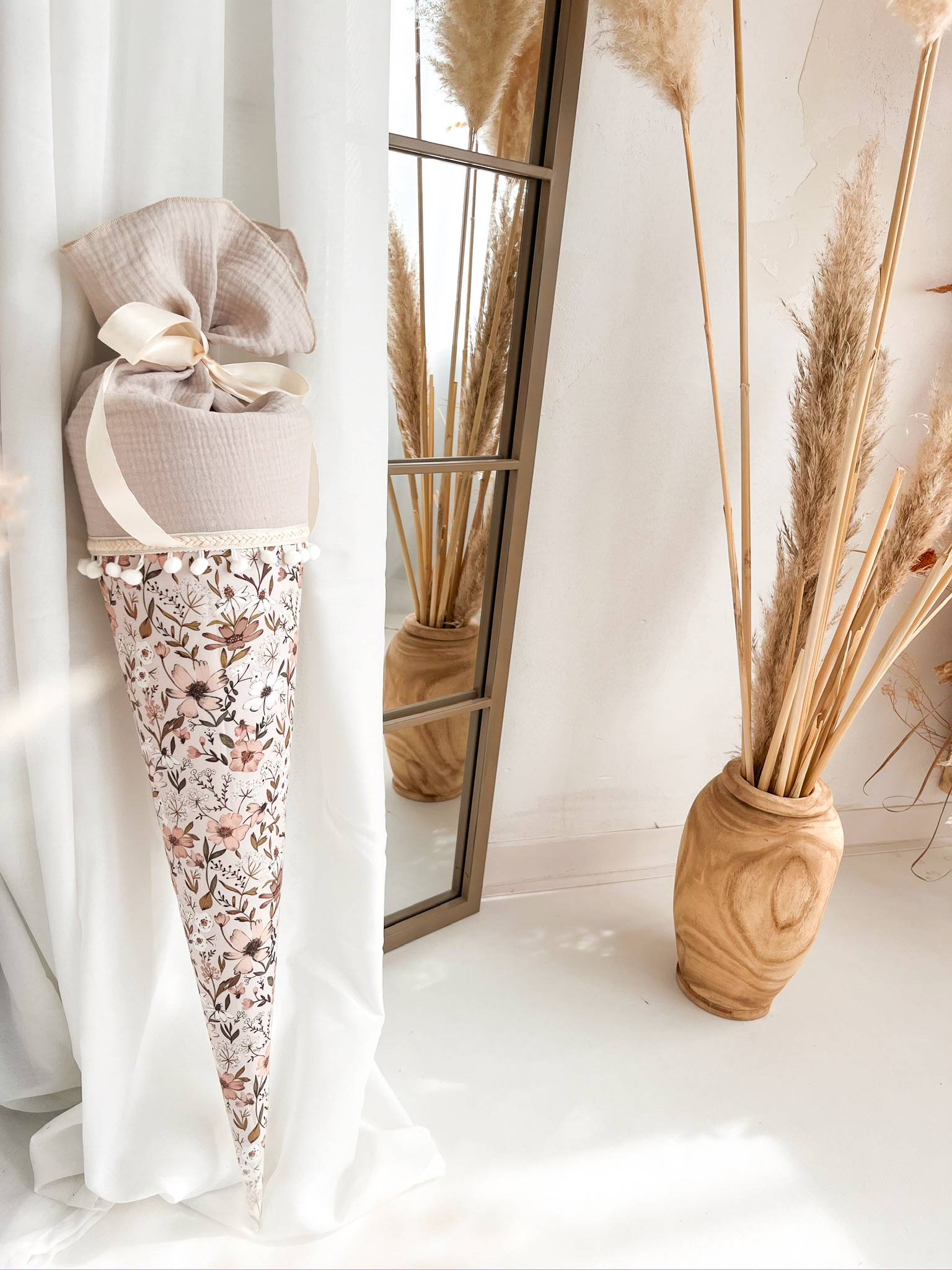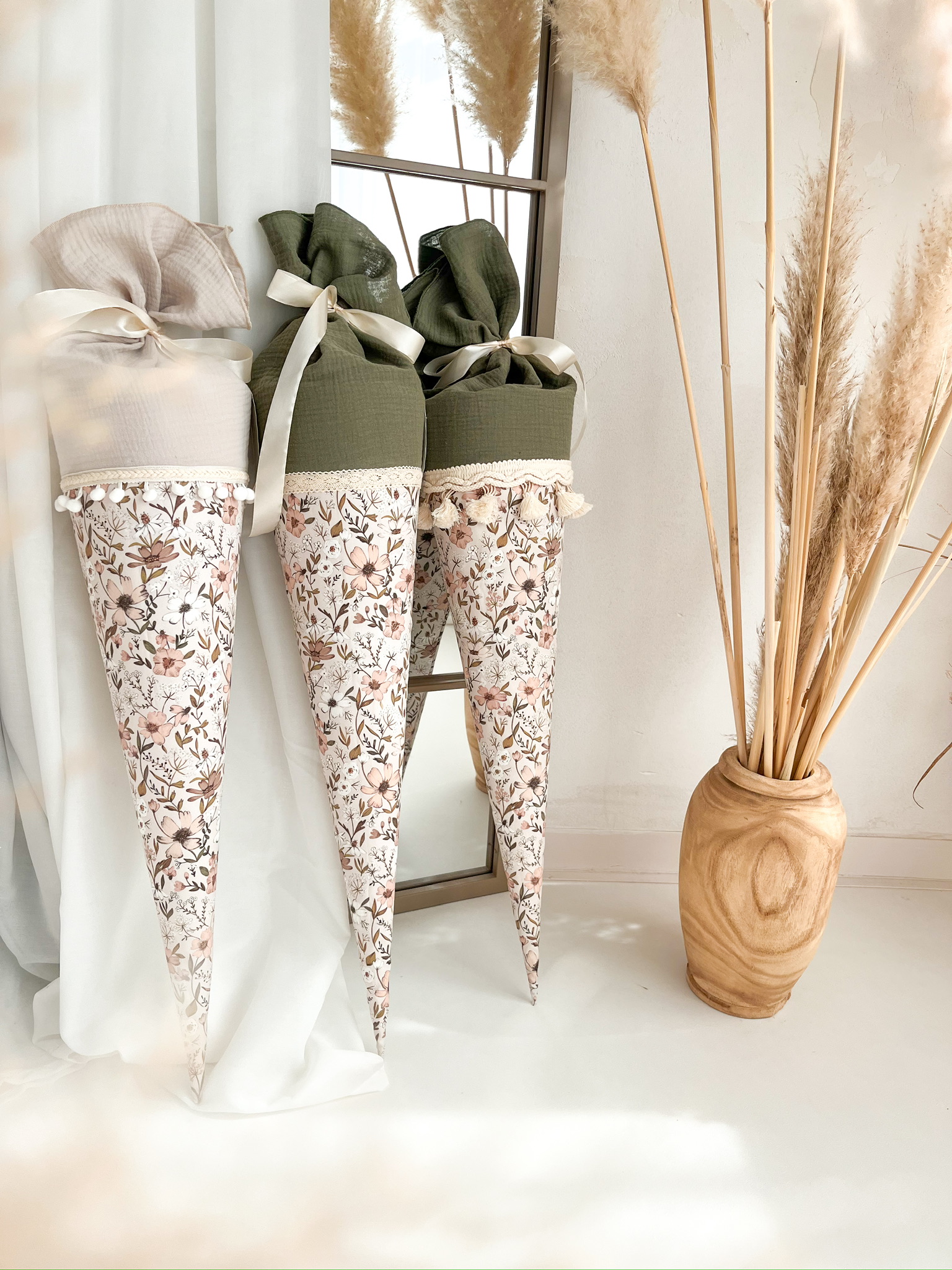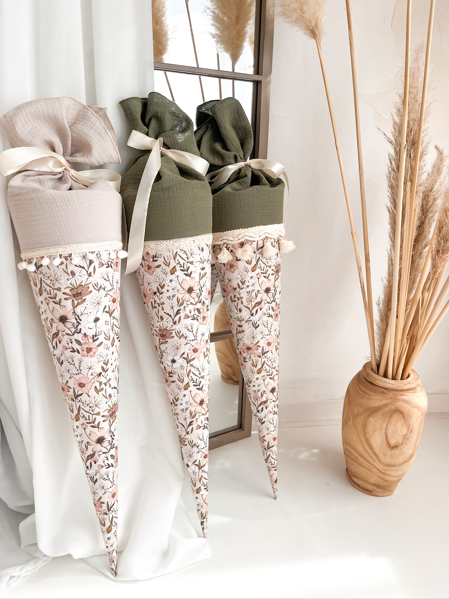 Entzückend und in aufwendiger Handarbeit gefertigt präsentiert sich diese Schultüte aus feinem Musselin und Baumwollstoff, liebevoll verziert mit dem Namen deines Kindes.