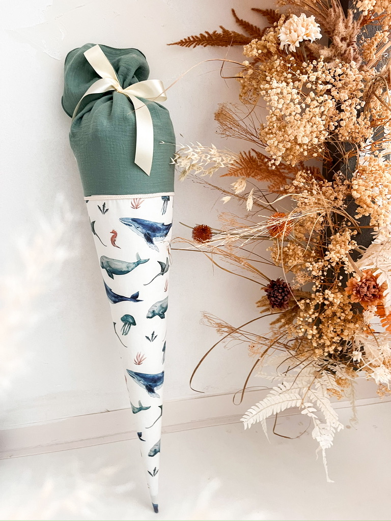 Schultüte aus Stoff optional mit Namen, Holzanhänger oder Innenkissen. Entzückend und in aufwendiger Handarbeit gefertigt präsentiert sich diese Schultüte aus feinem Musselin und Baumwollstoff, liebevoll verziert mit dem Namen deines Kindes. Der Schultütenrohling aus Karton zur Stabilisierung ist bereits im Lieferumfang enthalten und misst stolze 70cm oder 85 cm. Mit dem sorgfältig ausgewählten Stoff ummantelt, erreicht die Schultüte eine Gesamtgröße von ca. 100cm bzw. 115 cm. Auch für Geschwister bieten wir die passende "Zuckertüte" an, mit Maßen von 35 cm für den Rohling und ca. 50 cm mit dem Stoff bezogen. Entdecke außerdem die Auswahl zwischen einer dekorativen Borte inklusive Bommeln oder einer schlichten Variante mit Kordel, um sicherzustellen, dass deine Schultüte ganz individuell gestaltet ist und perfekt zu dir passt. Verpasse nicht die Gelegenheit, auch unsere anderen zauberhaften Designs von Schultüten zu entdecken! Wir laden dich herzlich ein, in unserem Shop weiter zu stöbern und das Passende für dich zu finden. Besuchen Sie auch unsere Instagram-Seite @lubuschko_handmade oder unseren Online-Shop www.lubuschko.de, um einen Einblick in unsere Arbeiten zu erhalten. Wir freuen uns darauf, Ihnen eine unvergessliche Schultüte zu kreieren.Die Schultüten sind aus 100% Baumwolle Herstellerangaben: Katharina Gruhn Dorfstraße 1f 01920 Ralbitz-Rosenthal info@lubuschko.de www.lubuschko.de Artikelnummer: ART-00029